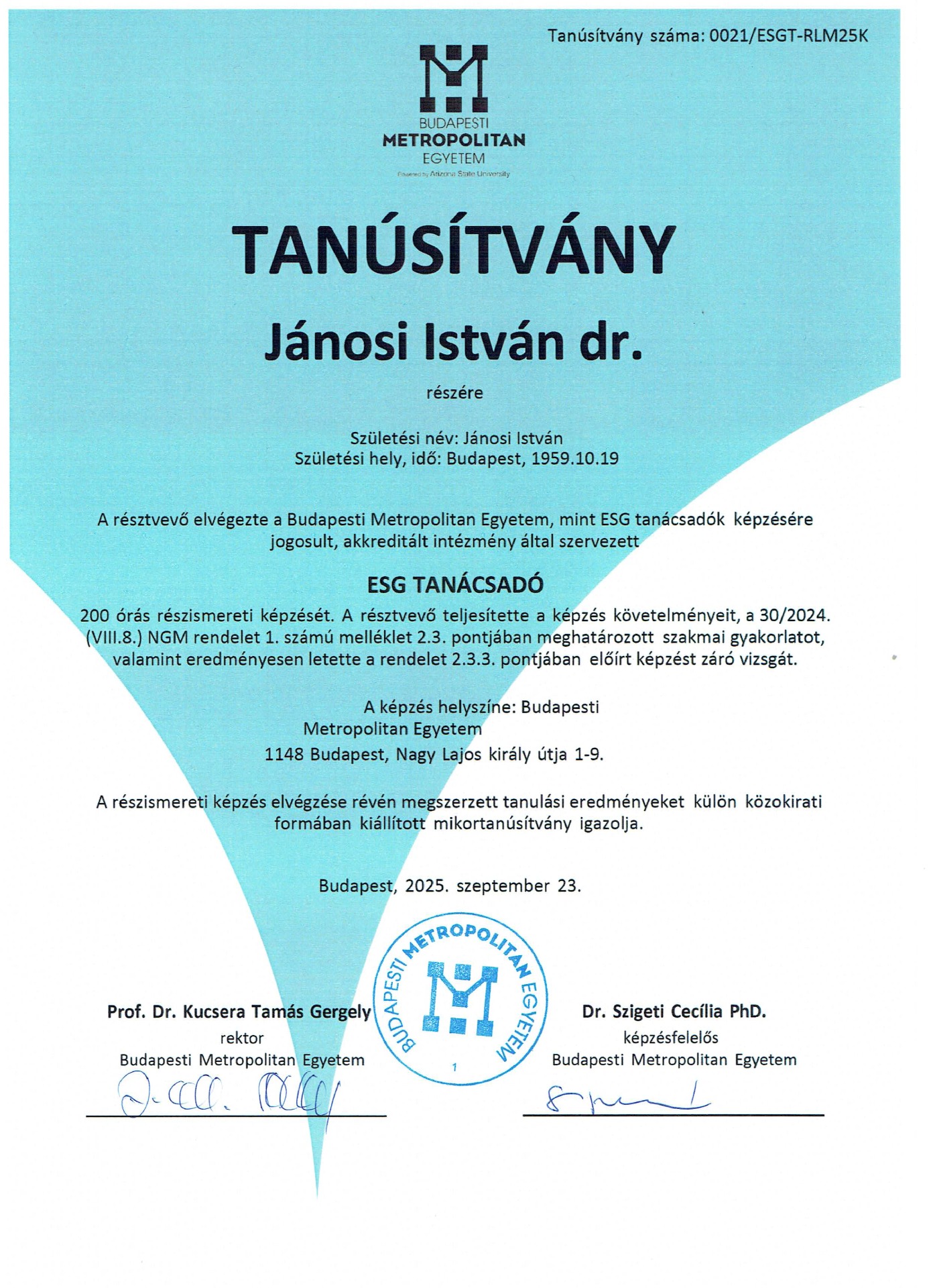 a GB Academy -nál (Certified Sustainabiltiy Manager (CSM) képzettség), a Metropolitan Egyetem ESG Tanácsadói képzését, és megkaptam az SZTFH-tól az akkredtitált ESG tanácsadói minősítést (SZTFH